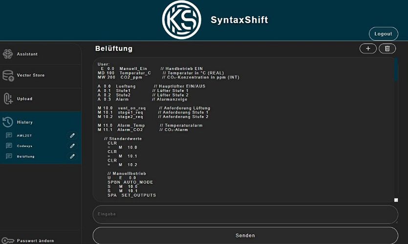 - SyntaxShift di KS Solutions AG: conversione del codice basata sull'intelligenza artificiale per diversi standard PLC (ad esempio, Siemens IL, SCL ↔ CODESYS ST).