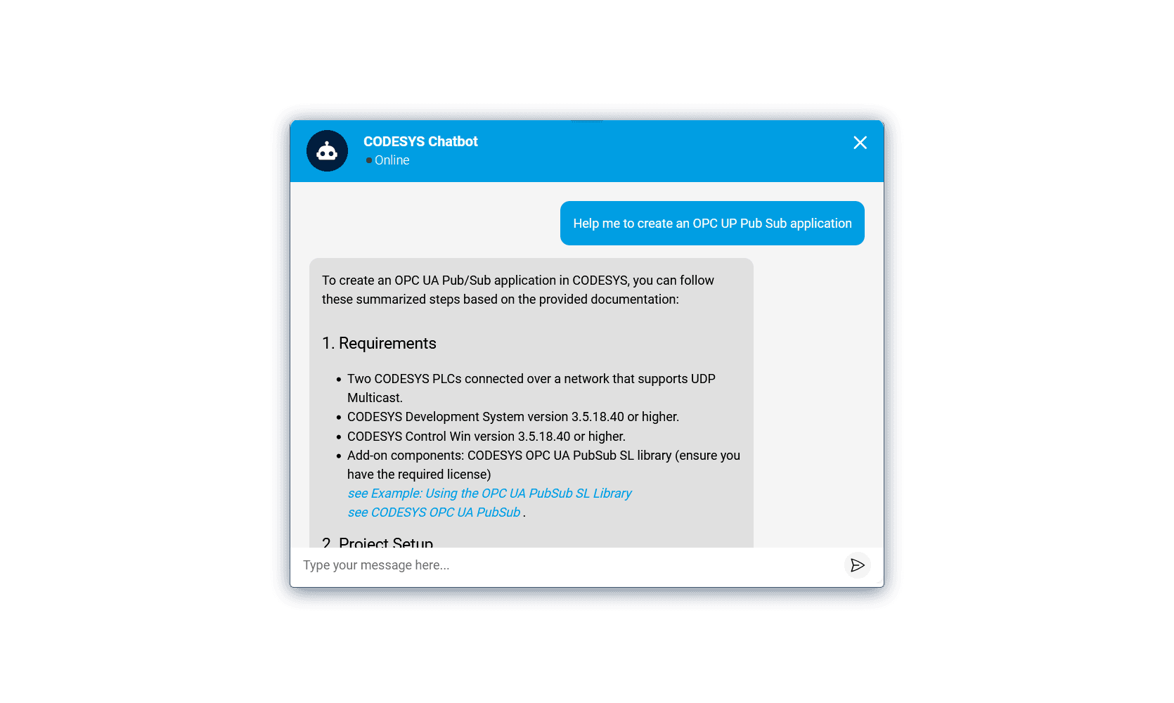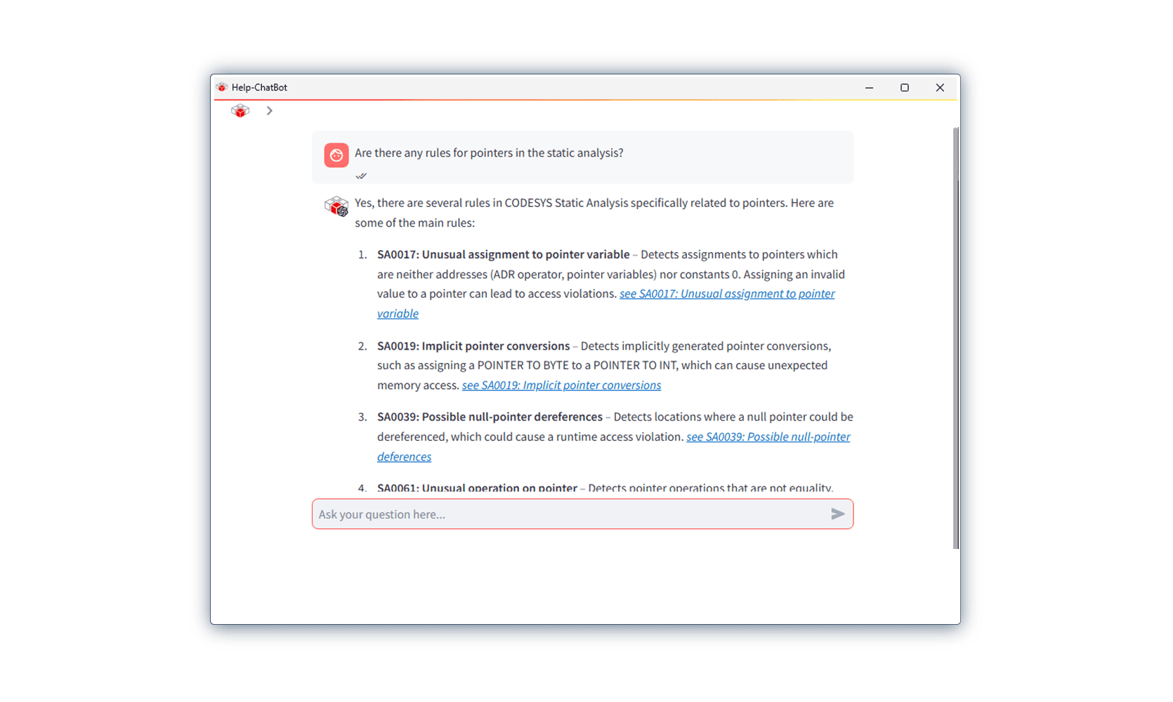 - Accesso più rapido e semplice alle informazioni della Guida in linea di CODESYS con supporto basato sull'intelligenza artificiale, compresi esempi di applicazioni specifiche.