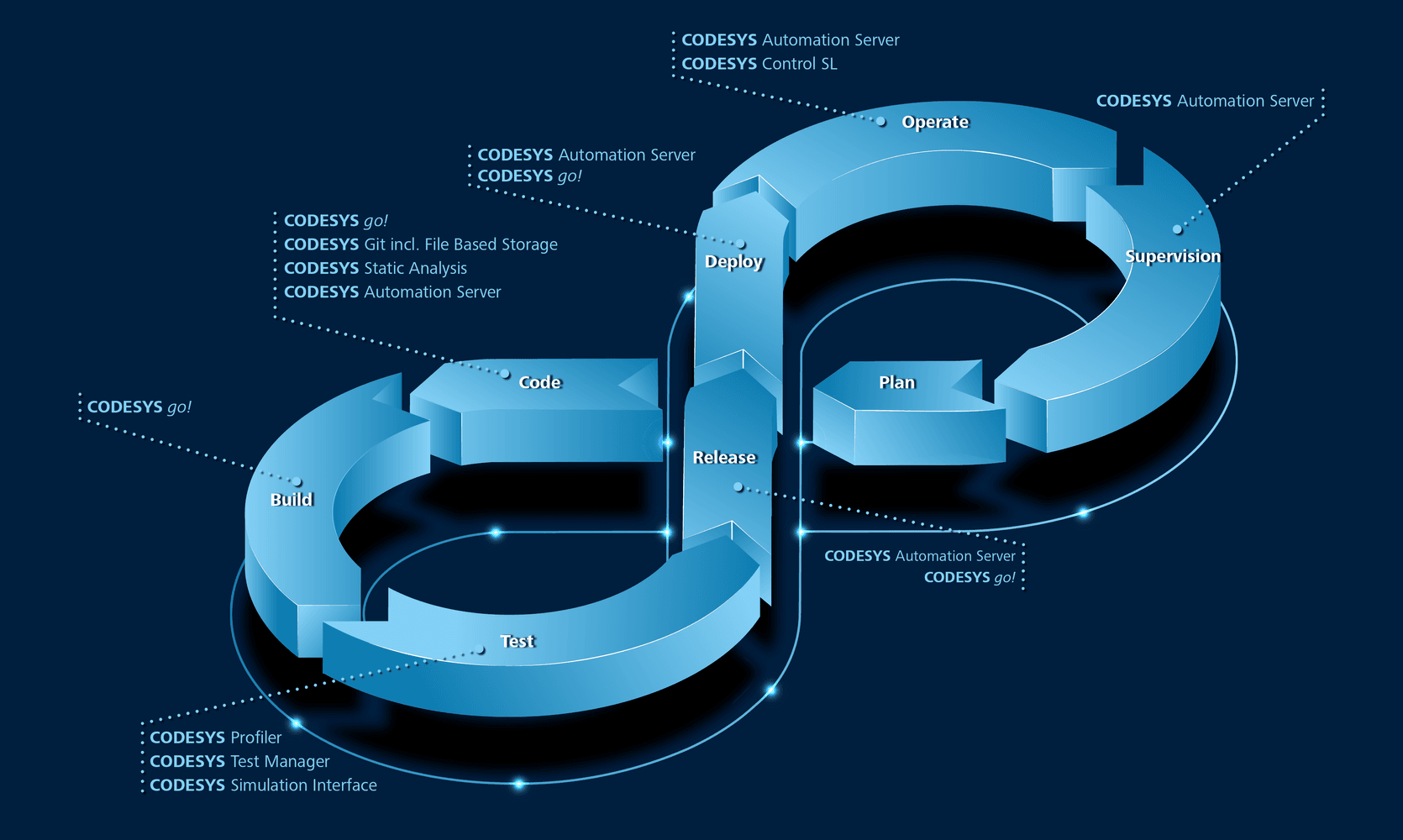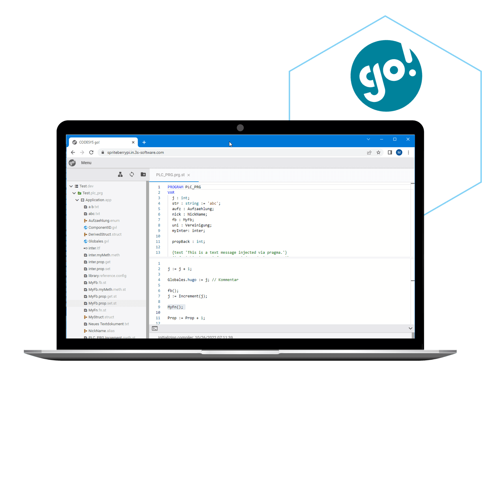 CODESYS go! è un ambiente di sviluppo basato sul web per il controllo di macchine e sistemi. L'architettura è divisa in frontend e backend; in informatica si parla regolarmente di soluzione server/client. Nel caso di CODESYS go! il frontend corrisponde anche al client, ma il backend può essere eseguito non solo su un server (edge), ma anche nel cloud, su hardware PC standard o addirittura sul PLC stesso.